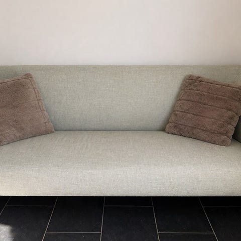 Säljer en stilren och bekväm tvåsitssoffa i mörkgrå färg. Soffan är i mycket fint skick, nästan som ny, då den bara använts i några månader.