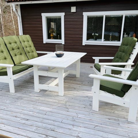 Rejäl Utegrupp i trä med bord, soffa och två fåtöljer