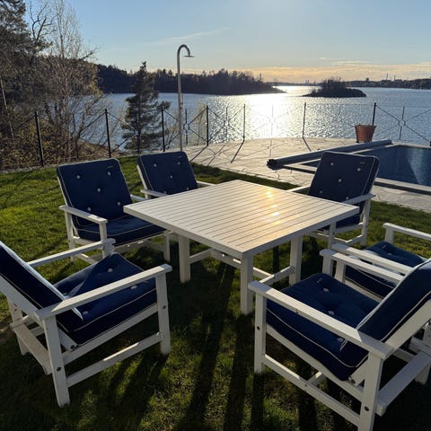 Stabil utegrupp i trä med bord, soffa och två fåtöljer, alla med tjocka blå dynor