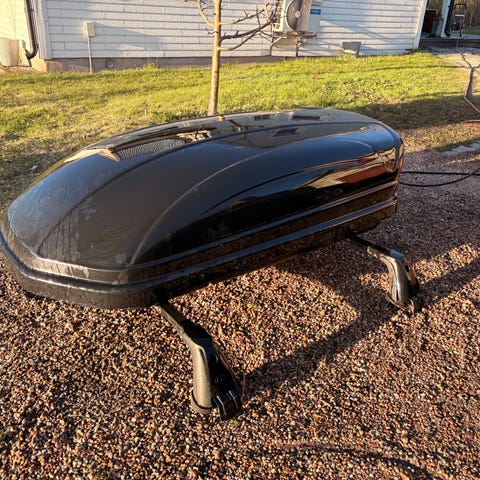 Volvo takbox i svart med tillhörande lastbågar, enkel att montera på bilen. Bra med plats för packning och skidutrustning.