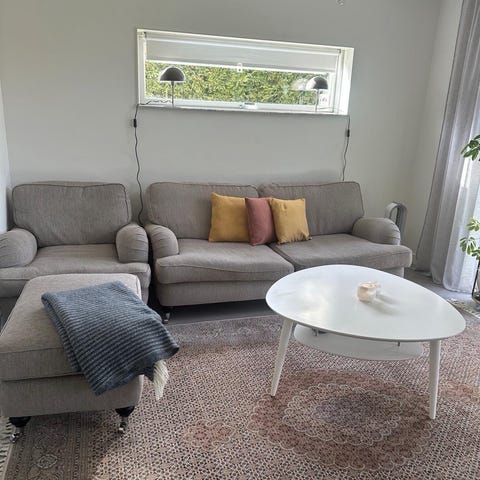 En underbar soffa som är hela 115cm djup! Säljes med en tillkommande fotpall. Färgen är Greige och tyget är både impregnerat och har 100.000 på martindale skalan som gör den oerhört slitstark. Ingår 3 st soffkuddar i samma färg. Soffan är ca 1 år gammal och fotpallen 6 mån men båda i nyskick. Inga fläckar eller synligt slitage.