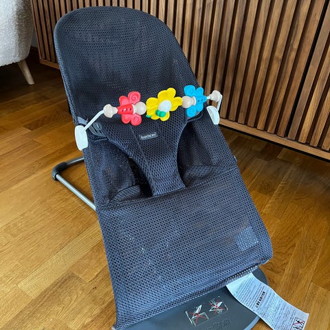 BabyBjörn babysitter i mörkgrått med quiltad sits och lekbåge med färgglada träfigurer. Ingår också en mörkgrå BabyBjörn-bärsele med vadderade axelband och enkel spänneslösning framtill.