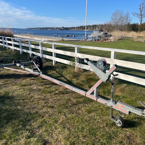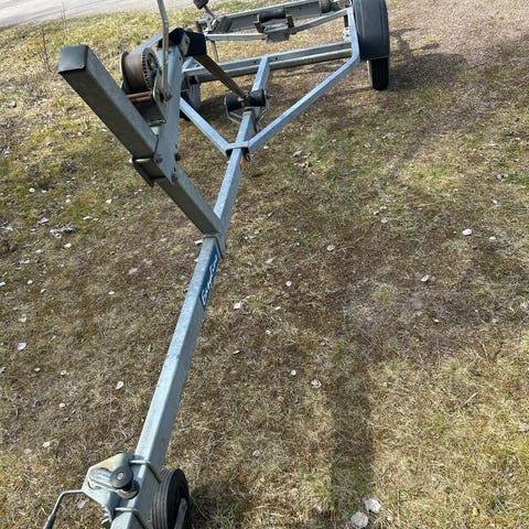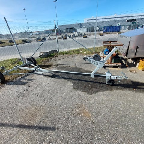 Galvaniserad båtvagn/släpvagn med flera rullar och justerbara hjulstöd. Utrustad med vinsch fram och bakljus med registreringsskyltshållare. Med besiktning