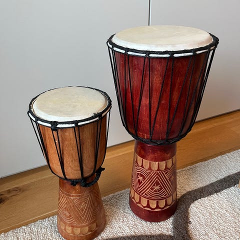 Två djembe-trummor i olika storlekar med träsarg och spänd skinnyta. Säljes tillsammans, fina som både instrument och inredningsdetalj.