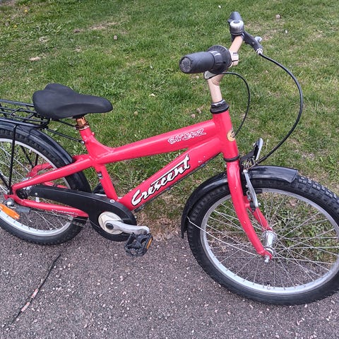 Röd Woom GO 3 barncykel med 16" hjul och handbromsar fram och bak. Utrustad med skärmar och stöd, samt reflexer och ringklocka.