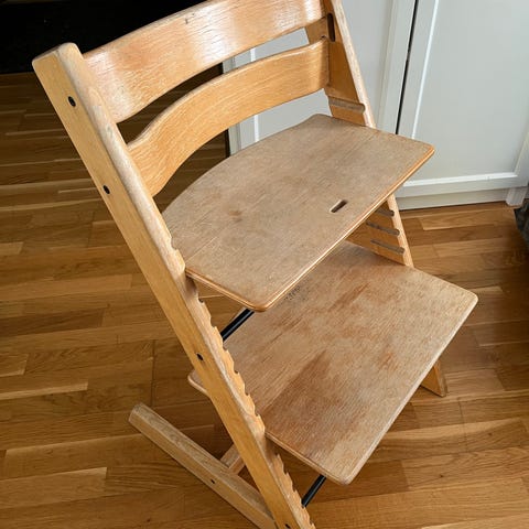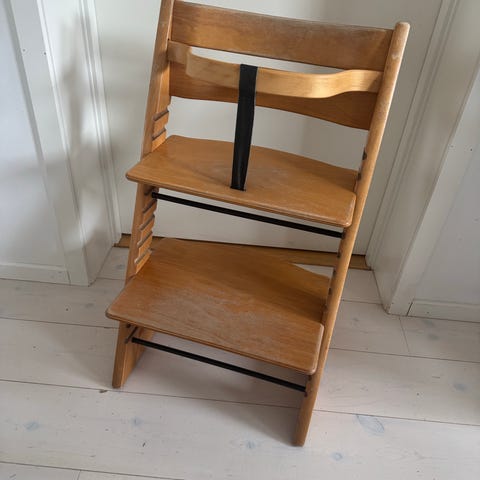 Stokke Tripp Trapp matstol i trä med justerbar sitt- och fotbräda. Bygel framtill med rem mellan benen för extra stöd. Väl använd men inget fel på funktion! Går att använd som den är eller måla/lacka om för den som vill!