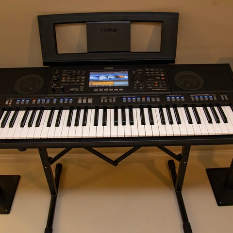 Yamaha PSR-E343 komplett med nothållare, adapter, manualler, och en robust stativ. En bra keyboard som klarar av det mesta. Anpassad med pedagogiskt display med mycket information.