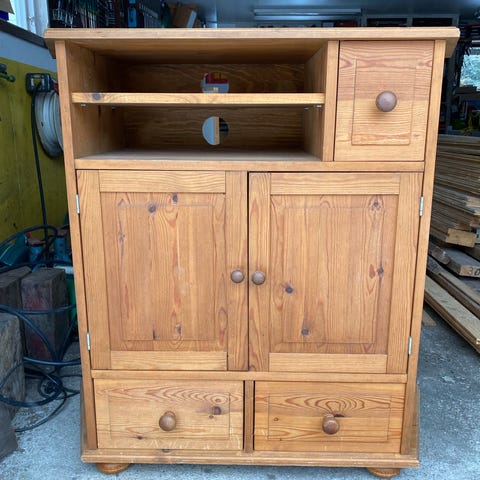 Utdragbar låda överst, sen hyllplan innanförtvå dörrar. Nyckel till dörrarna finns.