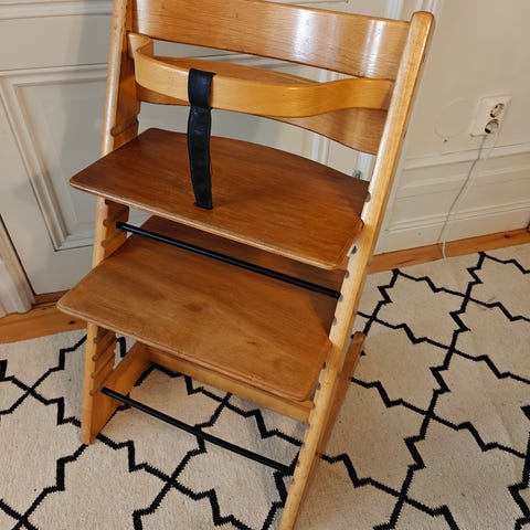 Stokke Tripp Trapp matstol i trä, med bygel och rem. Finns i Hörningsnäs i Huddinge.