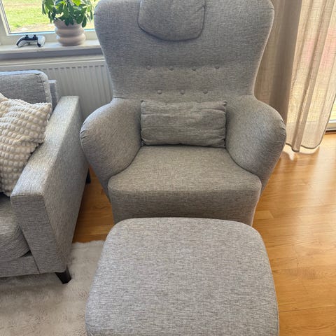 Tyget på fåtöljen är slitet med klösmärken från katt. Inget fel på komforten och den är ej nedsutten. Rekommenderar att köpa nytt tyg på ikea, så blir den som ny.