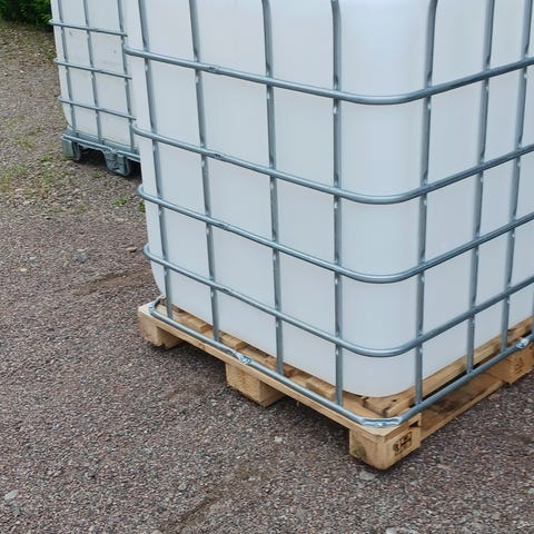 Stor IBC-tank på 1000 liter med tappkran nertill. Står i metallbur och är uppallad på trä/pall för enklare avtappning.