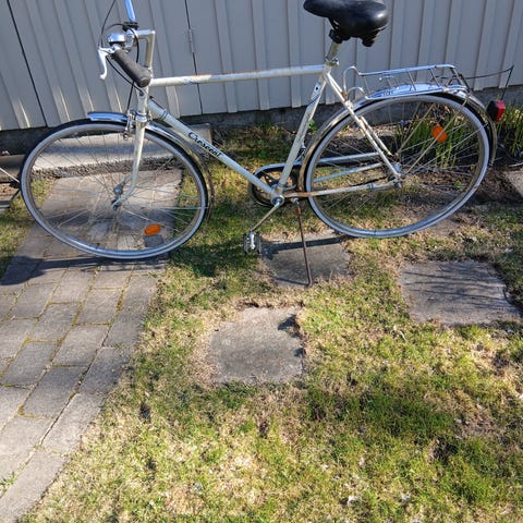 DBS hybridcykel för kvinna med 28" hjul i lila ram. Har pakethållare bak, skärmar och handbromsar fram och bak. 21 växlar. Växlar bak behöver justeras. Cykeln är från 1998, kostade då 5395 kr. Lite använd. Inte alls använd de senaste 20 åren.