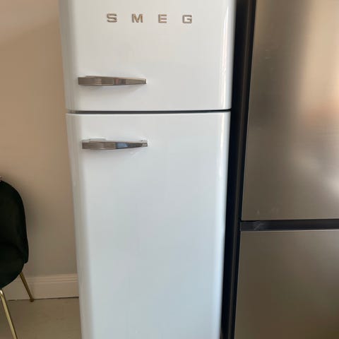 En riktigt cool pjäs från SMEG. Modell FAB32LON1 specialmodell som är lite högre och även större frys (75 liter) och kyl (229 liter). "Frost free"-funktion som fungerar bra. Modellen har endast sålts (vad jag förstår) till företag och fanns inte i vanliga butiker. Denna är varsamt använd, har en litet hål i frysdörren som inte påverkar utseende eller funktion. Larmar när man glömmer stänga dörren. Har två hjul bak för att kunna flyttas ut enkelt, justeras för ojämnt golv fram.