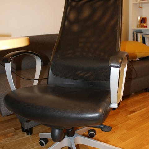 Svart kontorsstol i läder med hög rygg och stoppad sits, armstöd, snurrfötter i metall och hjul, rullar lätt.