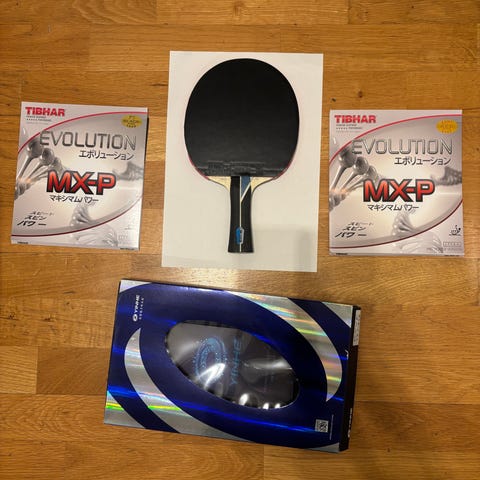 Komplett pingisracket med Tibhar Evolution MX-P (svart 2,2mm & röd 1,8mm) på en kolfiberstomme med bra kontroll XVT classic carbon (lackad). Olika tjock svamp är perfekt för den som vill ha lite mer kontroll på exempelvis BH och mer kraft i FH. (179,7g). Inte perfekt limning, därav priset.