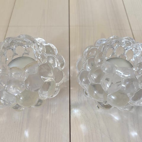 Två stjärnformade ljuslyktor i klart glas från Orrefors. Passar till vanliga värmeljus och har lite tyngd så de står stadigt på bordet.