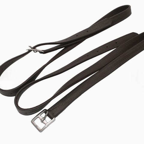 Stigläder 135 cm dam. Smidigt läder med nylonförstärkning som förhindrar att lädret töjer sig. Rostfria spännen. Svarta. Fortfarande fina, använda men inte slitna eller spruckna. Nypris 350 kr.