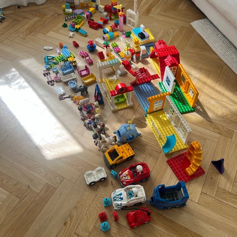 LEGO DUPLO med blandade klossar, djur och gubbar i flera färger. Innehåller bl.a. fordon, polis-båge, matvagnsdelar och stora gröna byggplattor för att bygga på.