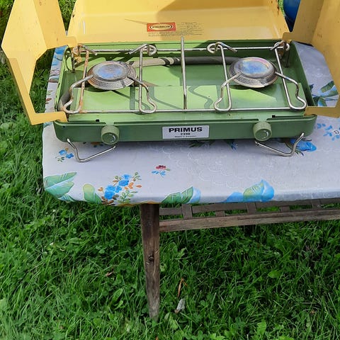 Gasolkök med två plattor och lock, står stadigt på bord eller bänk. Enkelt att reglera värmen med rattarna på framsidan.