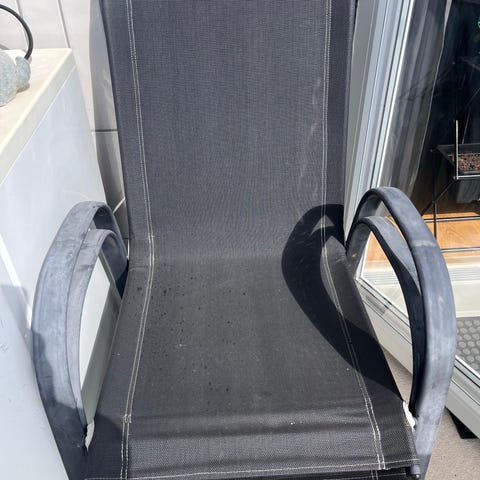 Två svarta utestolar med metallstomme och nätsits/rygg. Sköna armstöd och stapelbara så de är lätta att ställa undan.