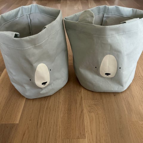 Två stora Jox tygkorgar från Jollyroom i vit bomull med svart bergsmönster. Har handtag upptill och rund botten som gör dem lätta att flytta runt och ställa stadigt.