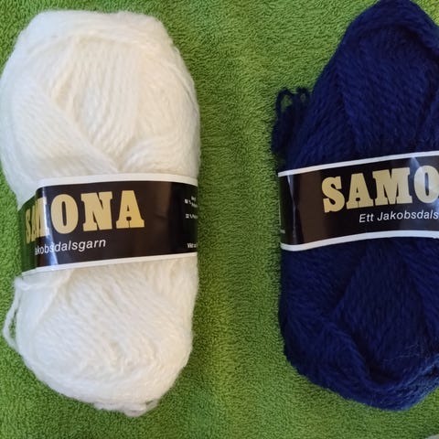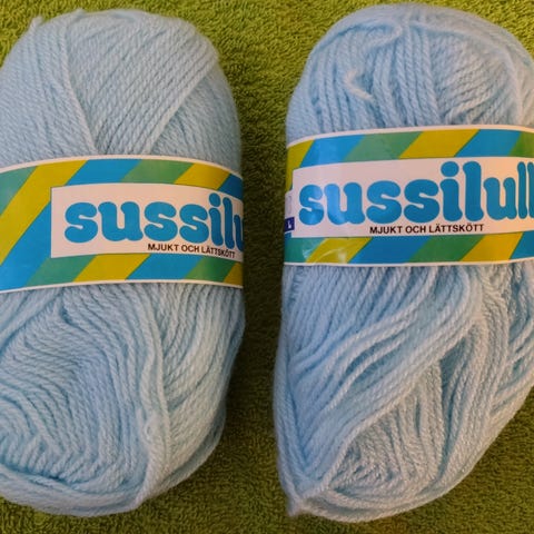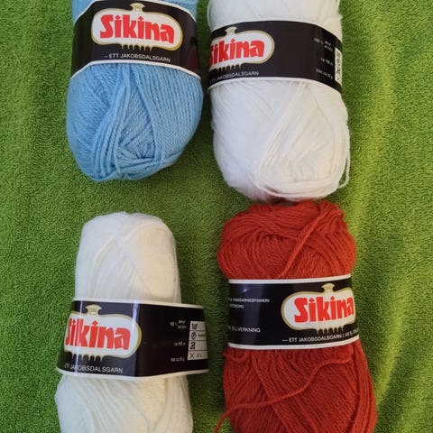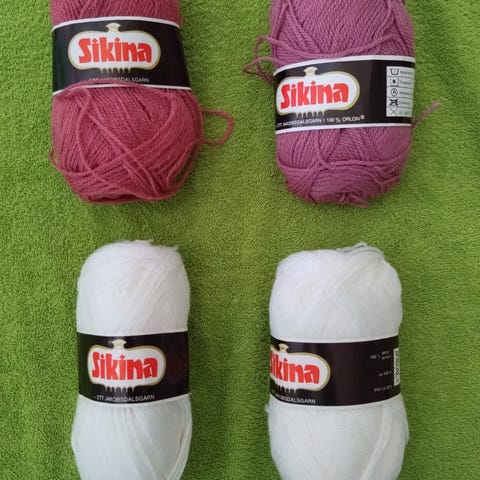 Garn i fina färger. Två vita, en duvblå och en ljunglila. 5 kr st. Aldrig använda. Fina och rena.