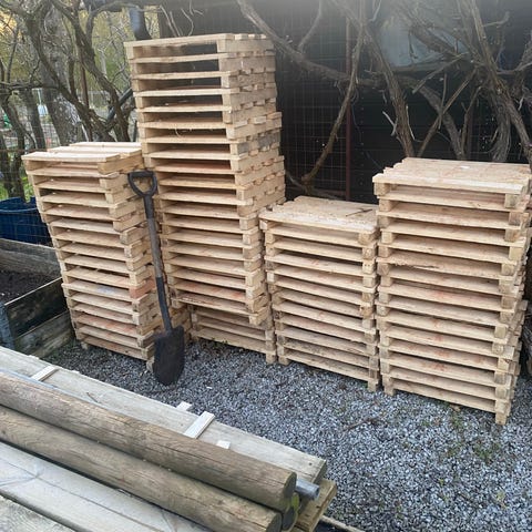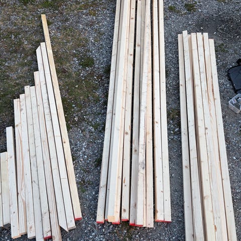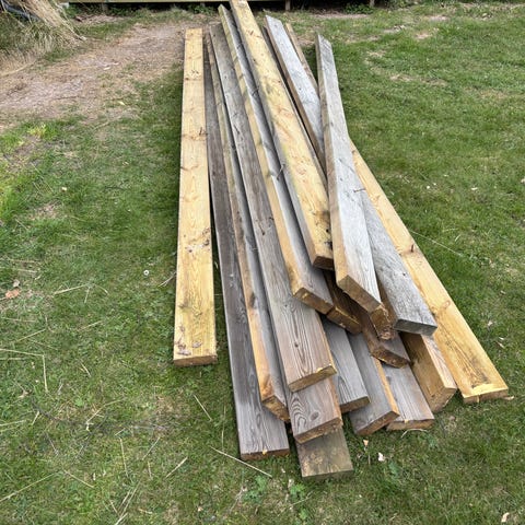 Blandat pallvirke och träbitar i olika längder. Bra för den som vill bygga eller ha extra virke hemma.