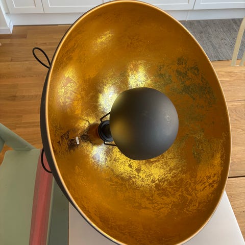 Säljer 2 st stilrena taklampor från PR Home, modell Classic Ø47 cm. Svart utsida med guldfärgad insida som ger ett varmt och mysigt ljus. Passar perfekt över matbord, köksö eller i vardagsrum.