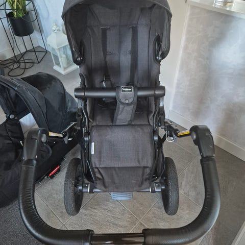 Bugaboo syskonvagn i svart med två sittdelar och stor varukorg under. Svängbara framhjul och justerbart handtag som är lätt att ändra efter behov. Finns även liggdel
