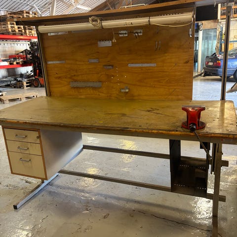 Stadig arbetsbänk i metall inkl skruvstäd. Perfekt som arbetsbord i garage eller verkstad där man behöver en rejäl yta att jobba på.