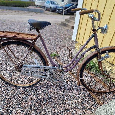 Gammal rostig, ett fint 635 framhjul med kromad fälg i fint skick, bakhjulet saknar några ekrar och jag vet inte funktion i övrigt på det då kedja saknas. Sadelstolpen saknas.