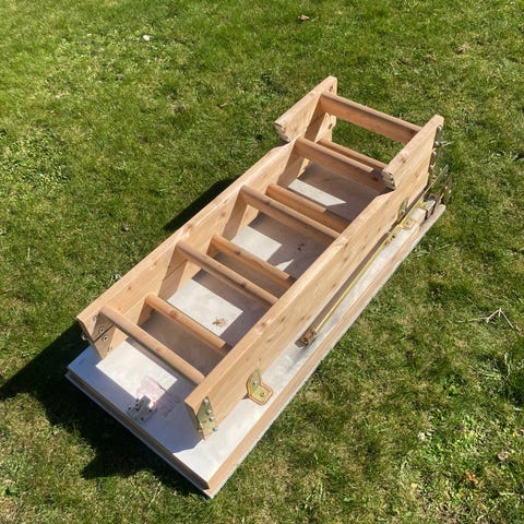 Vindstrappa från Dolle, modell ClickFIX 76 silver, mått 115x70 cm. Levereras hopfälld med lucka och stege i trä med plast runt för enkel hantering. Helt ny i förpackning.