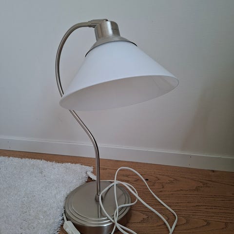 Snygg bordslampa med vit konformad skärm och metallfot. Har strömbrytare på sladden och ger ett behagligt ljus.