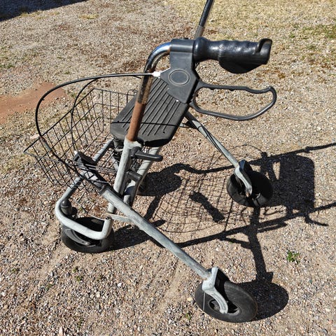 Rollator, helt fungerande, med korg och bricka, käpphållare och mugghållare.
