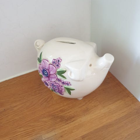 En söt spargris i keramik med blommönster.