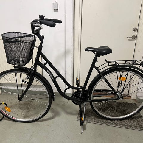 Stor ram (54 cm), 3 växlar, framkorg och pakethållare.