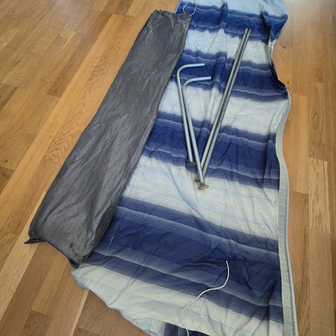 Mattan är 3,4 x 2,5 m och är gjord av polypropylen. Den är luftgenomsläpplig vilket gör den väldigt lätt. Mattan är enkel att rengöra – bara sopa bort smuts, skölj av med vatten och hänga upp på tork. Mattan är dubbelsidig och kan därför användas med valfri sida uppåt, UV-skyddad och behåller därmed färger och egenskaper mycket länge. Fastsydda öglor gör att mattan lätt kan fästas i marken med tältpinnar. Nypris 1300 kr, använd två gånger. Säljes pga byte av vagn.