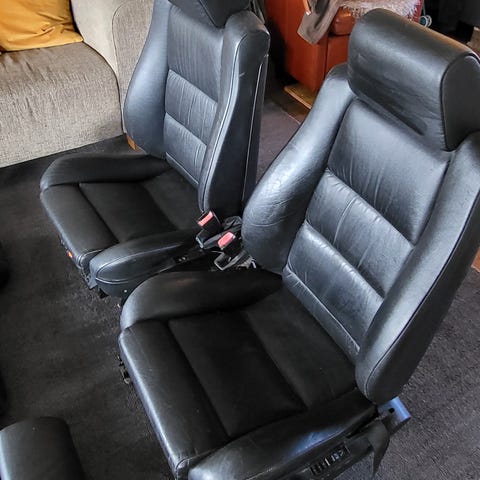 Två bilframstolar i grått med svart mittparti. Har integrerade nackstöd och synliga skenor under för montering i bilen. Elektrisk justering av stolarna förarstol med minne