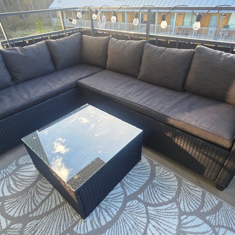 Soffgrupp med soffa, två fåtöljer och rektangulärt bord i grått med aluminium stommar. Dynor som tål vatten i mörkgrått tyg och bord med slät skiva som är lätt att torka av.