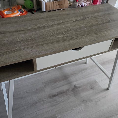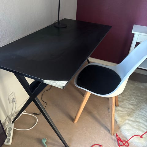 Svart stilrent skrivbord, med en grå stoppad stol i sammet. Nästan nytt. Använt en månad för home styling. Fyndpris 500 kr för både bord och stol.