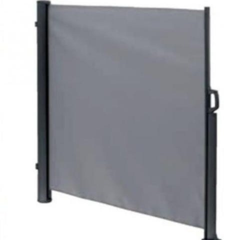 Utdragbar sidomarkis i beige, 300 cm bred och 180 cm hög. Fästs mellan två stolpar och dras enkelt ut när du vill ha mer insynsskydd eller skugga.