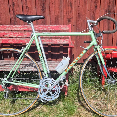 Klassisk fransk Peugeot tävlingscykel från 1981. Det är troligen modellen PX10DU eller en PY10. En proffscykler som min pappa tävlade med i början av 80-talet. Den har handbyggd ram och de eftertraktade Simplex växlarna i metall.