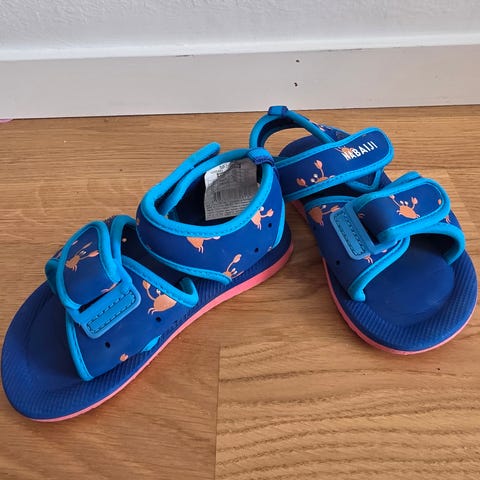 Blå Nike sandaler i stl 23 med svarta detaljer och röd flik framtill. Justerbar rem på sidan och hål upptill som släpper in luft.