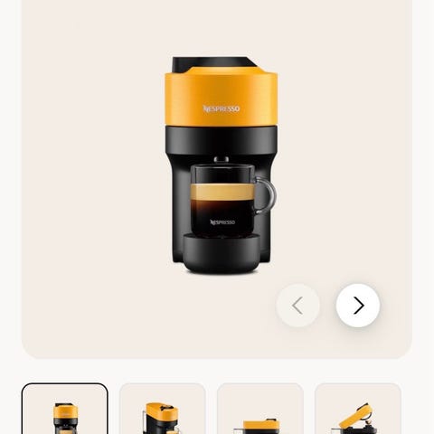 Nespresso kapselmaskin i svart med avtagbar vattentank baktill. Har uppfällbart lock upptill och droppgaller framtill för koppen.