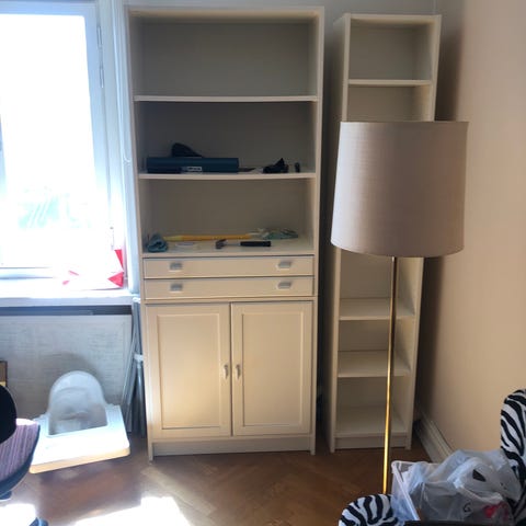 2 stycken vita Billybokhyllor med hyllplan. Kan användas till inbyggd bokhylla till exempel.