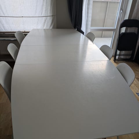 Säljer mitt köksbord och 6 tillhörande stolar. Bordet i bra skick men stolarna skulle man kunna fixa till med lite färg i kanterna, annars är allt helt och välfungerande. Benen går att skruva av när ni hämtar så borde det gå in i en stor vanlig bil. Vi fick in det i en Toyota rav4 när jag flyttade in