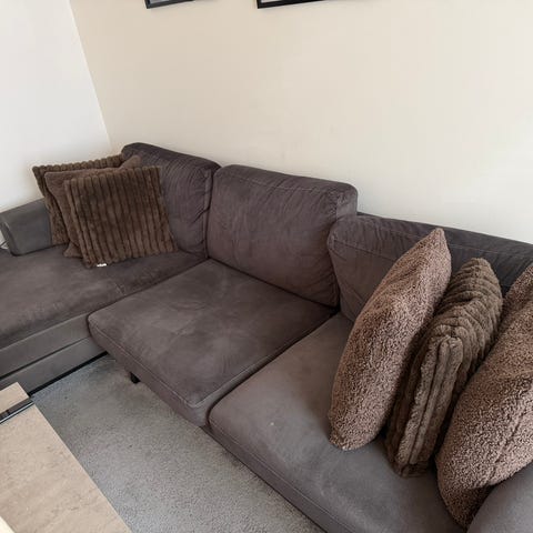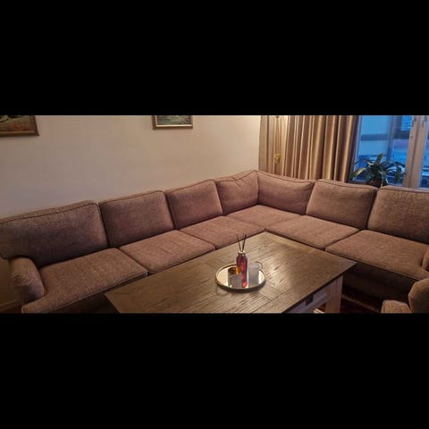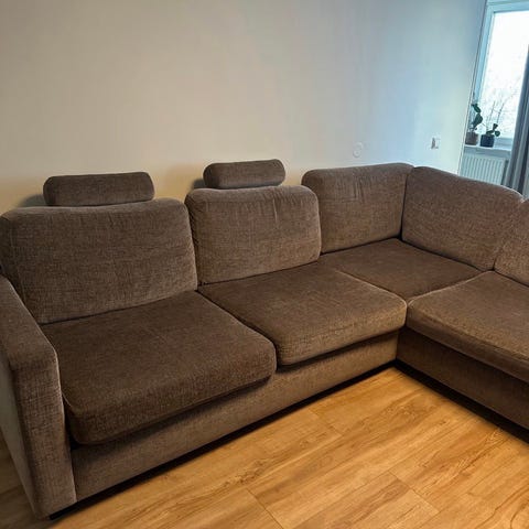 Stor IKEA hörnsoffa designad av Alberto Meda i brunt tyg med schäslong. Mörkare nederdel och ben i trä som syns på bilderna.