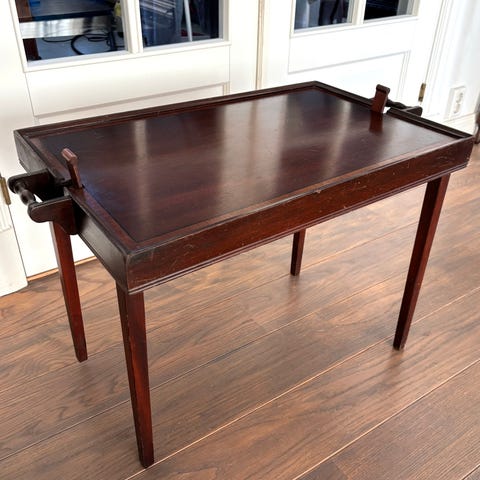 Trämaterialet ser ut som teak. Ingen stämpel eller signatur finns under bordsskivorna.