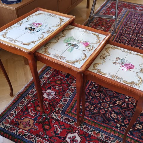 Det största bordets H 55 cm, B 33 cm och L är 60 cm. Det mellersta bordets H 51 cm, B 33 cm och L är 55 cm och det minsta bordets H 48 cm, B 33 cm och L är 49 cm.