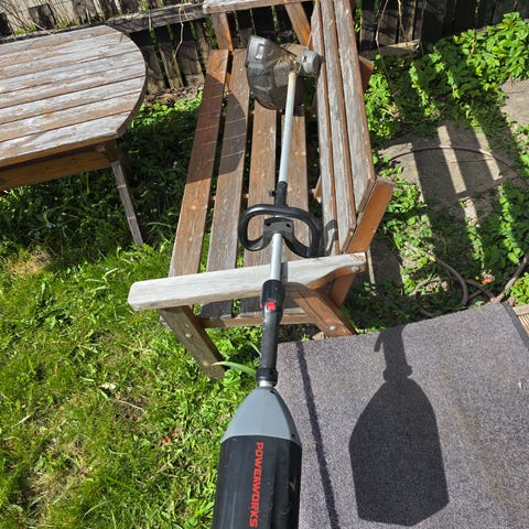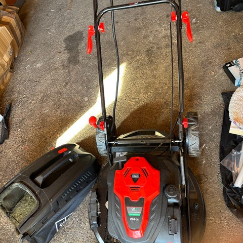 Powerworks 60V batteridriven gräsklippare med justerbart handtag och stora hjul. Medföljande 60V-batteri och laddare syns på bilderna.